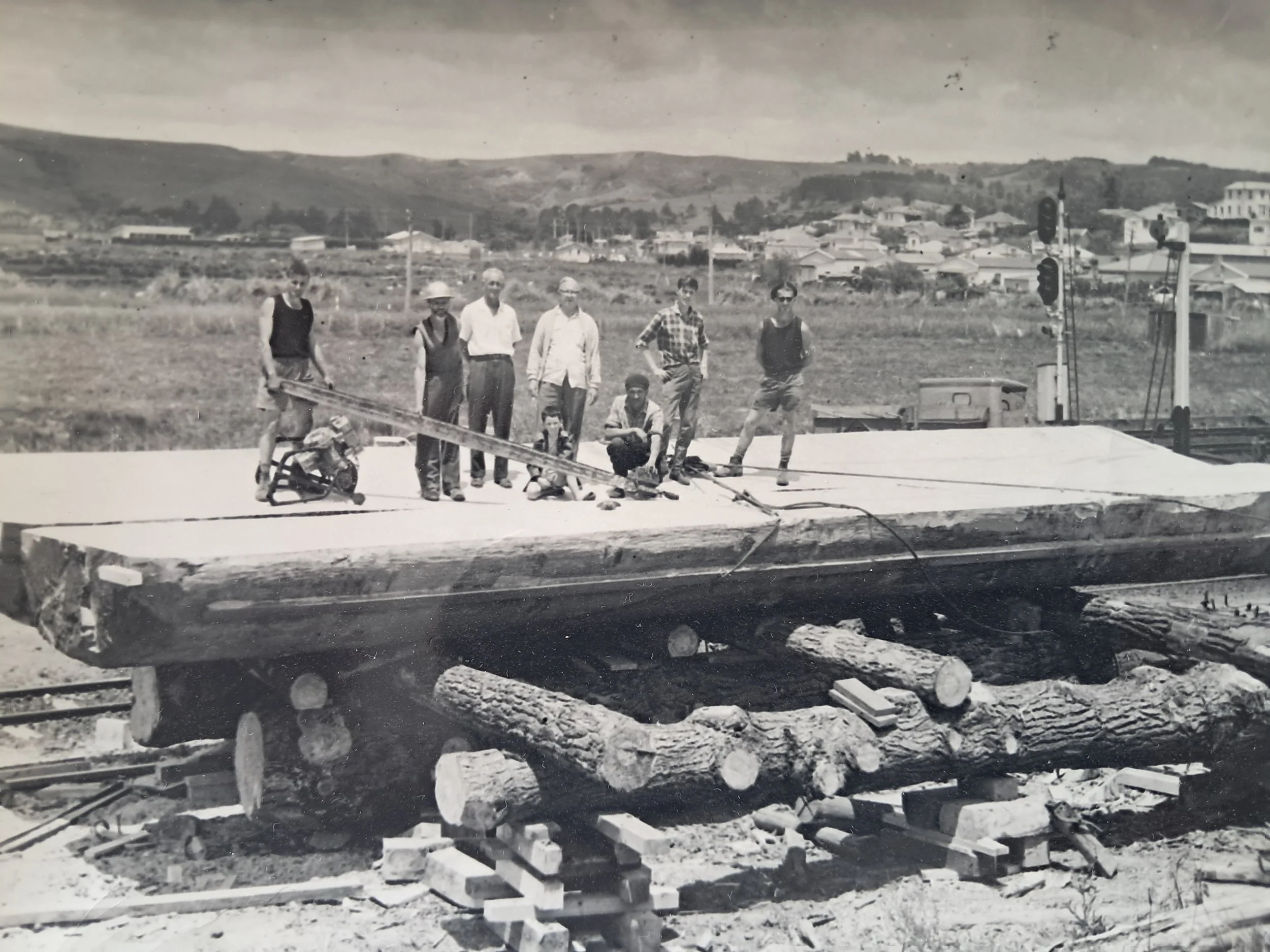 In the days of wooden boat building, boat builders would travel to select the timber for each boat. Here are workers from the famous boat builder, Percy Vos Ltd, on a kauri log they will use to make a boat. Photo / T.W Collins from the Brooke family collection.